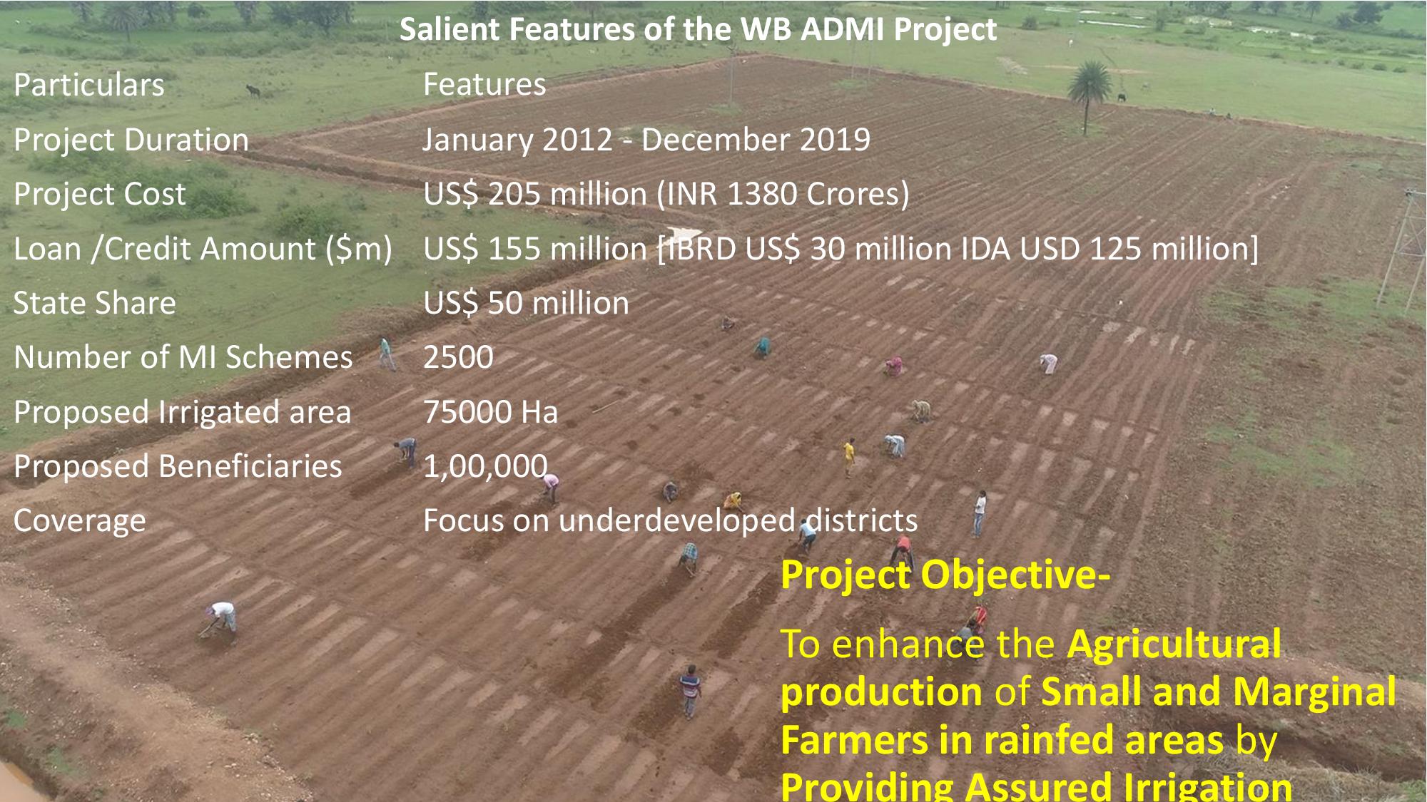WBADMI Project (2012-2019) with the World Bank support was an innovative project to reach out to the small & marginal farmers particularly tribal and women. The Project is unique in the sense that till now all the irrigation project/programs were executed in the silos/isolation. This is for the first time that an integrated effort was made wherein Irrigation facilities combined with Agriculture, horticulture and fishery activities in the created command area. More importantly, Water Users Associations (WUAs) have been organized and empowered to operate & maintain their Irrigation schemes and better manage available water resource in a sustainable manner. The project provided the full flexibility, human & financial resources and single window delivery system to demonstrate integrated development model around irrigation. .